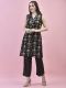 Black Color Floral Print Kurta with Comfort Pant. Knee length Sleeveless Kurta has Double Lapel Collar, Both side and short front slits, straight hemline. Pant has partially elasticated waistband, slip-on closure, one side pocket and curved hemline.