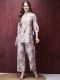 Lilac Multi Color Floral print Co-ord set. Hip length Tunic has 3/4 bishop sleeves, Shirt collar neck with V-cut, Both side slits, Curved hemline. Comfort pant has partially elasticated waistband with slip-on closure, One side pocket. Co-ord set made from Khadi silk fabric.