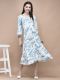 White and Blue color Ankle length A-line dress has 3/4 sleeves, V-neck with lace work, Both side pocket, Flared hemline, Dress made from Rayon (Liva) fabric.
