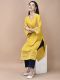 Mustard color Calf length embroidered Kurta has 3/4 sleeves, V-neck, Both side slits, Straight hemline, Kurta made from Rayon Slub (Liva) fabric.