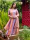 Peach and Lilac color Floral print A-line Dress with Dupatta. Ankle length dress has 3/4 sleeves, V-neck, flared hemline, Dress made from Rayon (Liva) fabric and Dupatta made from Chiffon fabric.