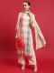 Off white Color Printed Kurta, Solid Comfort Pant, Printed Dupatta. Calf length kurta has 3/4 Flared sleeves, Round neck, Both side slits, Straight hemline. Pant has partially elasticated waistband with slip-on closure, One side pocket, Straight hemline. Kurta and Pant made from Rayon (Liva) fabric and Dupatta made from Chanderi fabric.