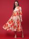 Peach Color floral print Ankle length Fit and Flare dress has 3/4th sleeves, V-neck, one side pocket, flared hemline, Dress made from Rayon (Liva) fabric.