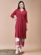 Red Color solid kurta with Comfort pant. Calf length kurta has 3/4 sleeves, V-neck, Both side slits, Straight hemline, kurta made from Rayon (Liva) fabric. Pant has partially elasticated waistband with slip-on closure, One side pocket, Pant made from Cotton cambric fabric.