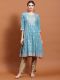 Teal Blue Color Floral Print Calf length A-line kurta has 3/4th sleeves, Round neck, one side pocket, flared hemline, Kurta made from Rayon (Liva) fabric.