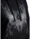 This black hoodie has a large, intricate rhinestone winged heart, with grey jagged lines and shapes behind it. Front kangaroo pocket and drawstring hood.