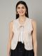 Beige embroidered shrug with neck tie-up details & tassel, Sleeveless Bohemian style & lace