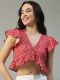 Women Red Check Print V-Neck Short Sleeve Crop Top with Ruffle Detail in Slub Fabric